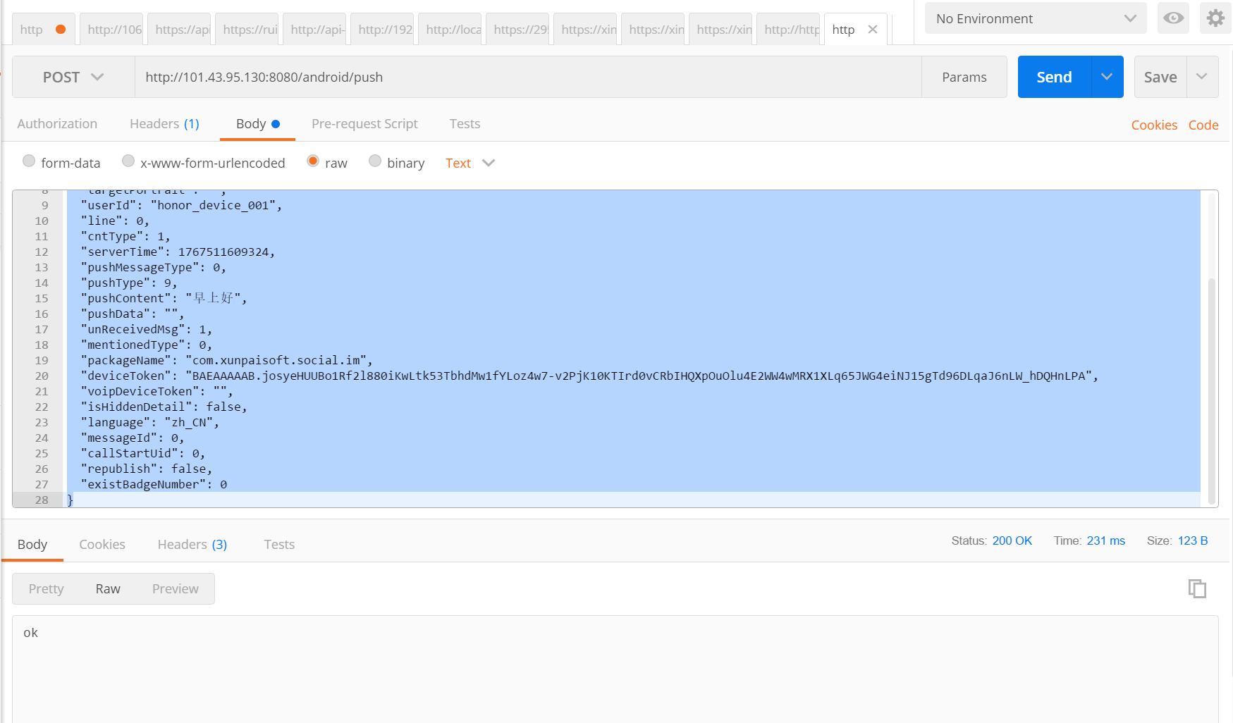 自己搭服务,使用postman可以跑起来 { "sender": "test_sender_001", "senderName": "卷毛小泡面", "senderPortrait": "", "convType": 0, "target": "honor_device_001", "targetName":…